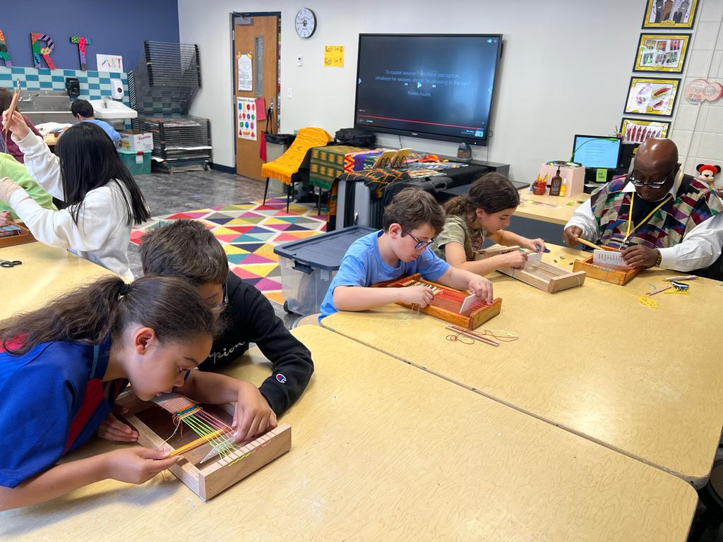 As usual, the kids had a fantastic time! Kwasi’s workshop is great opportunity for students to get away from their smart phones, tablets, TVs and laptops and to engage in a unified mind-body/hand-eye experience as they make their own Kente creations. Working with Kwasi’s specially designed small looms, students enter into a Zen-like meditative state that is good for reducing stress and anxiety. Visualizing the color patterns they want to create and seeing them come to life is a personally rewarding experience; the children also feel a sense of achievement as they learn to create something beautiful with their own hands. Many of the students were excited to show their Kente cloth bookmarks to their parents!